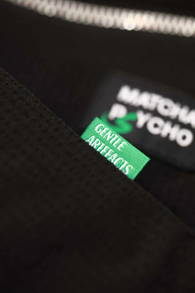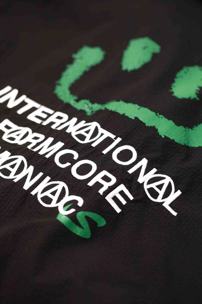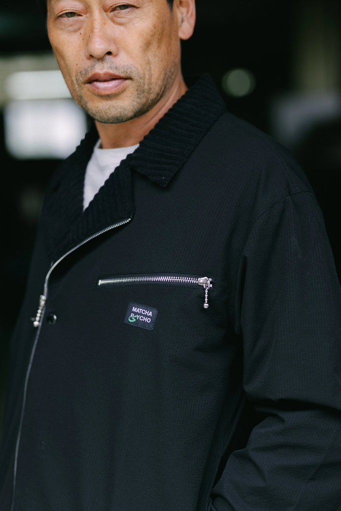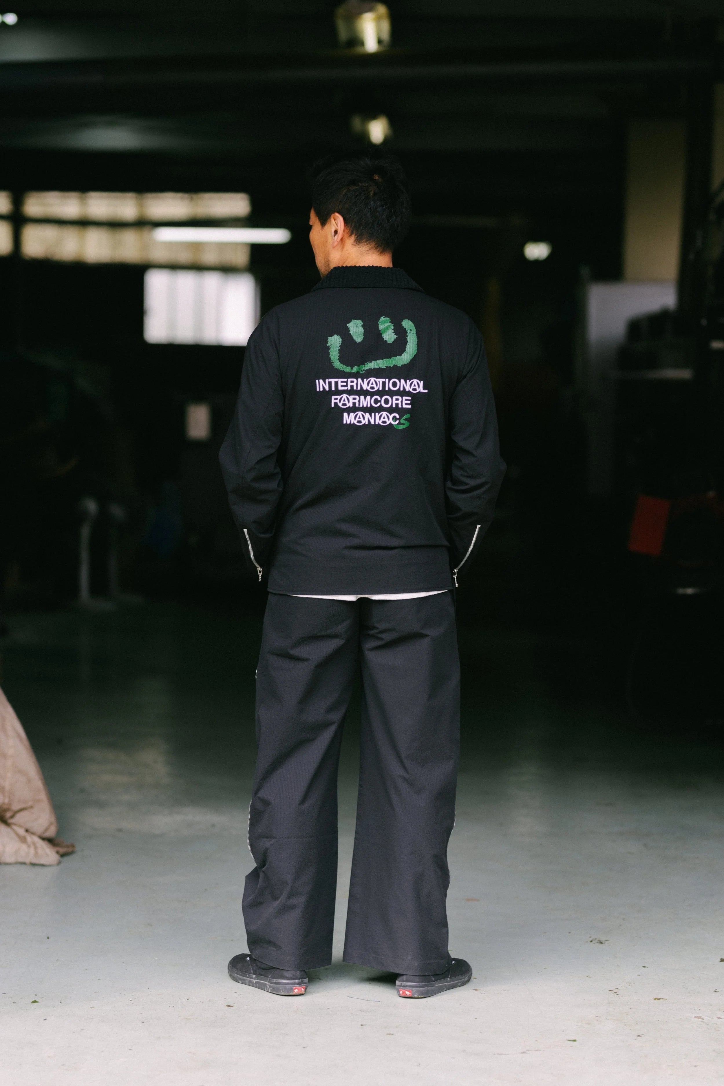 Cotton seersucker spring harvest jacket in black. A novel expression of tea farming workwear, with both biker jacket diagonal zip up and a Japanese samue-inspired fold and tie options. Fully lined interior direct to garment printed with imagery of Obubu Tea Farms, shot on site in Wazuka, Kyoto by Takeshi Hayakawa. Collection tagline—’International Farmcore Maniacs’—and green smiley logo printed on back. Matching workwear Punk Picking pants available.