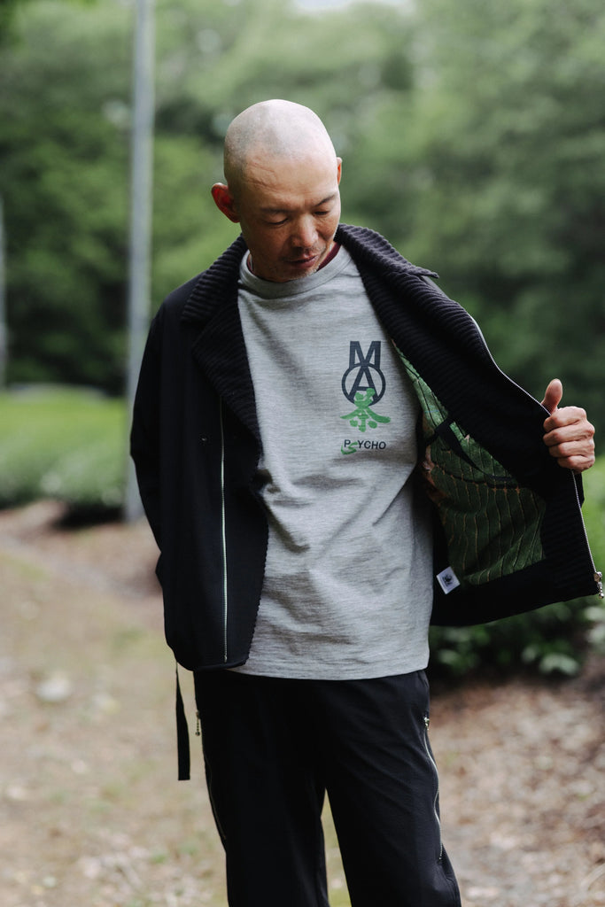 Cotton slub jersey fabric tee, with ribbed crew neck. Straight bottom. Direct to garment dye photo print of original artwork by Takeshi Hayakawa, captured on site at Kyoto Obubu Tea Farms for the Gentle_Artefacts X Sabotage collab.