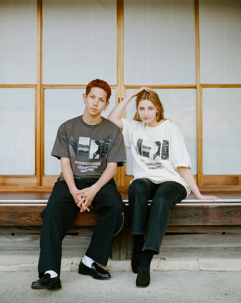 Cotton slub jersey tee, with ribbed crew neck and cuffs. Straight bottom. Direct to garment dye photo prints (in four vertical bars) of original artworks by Takeshi Hayakawa, captured on site at Kyoto Obubu Tea Farms for the Gentle_Artefacts X Sabotage collab.