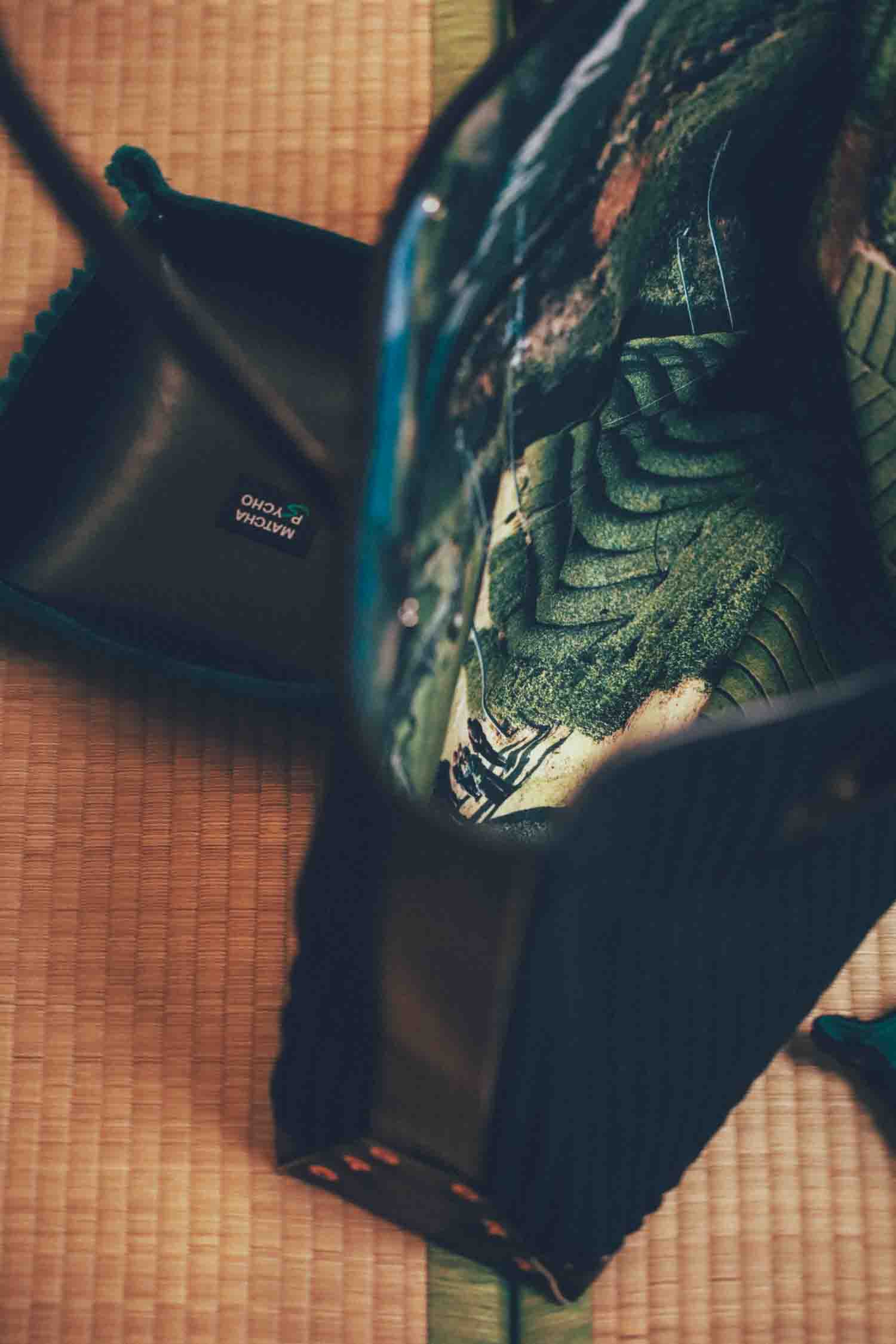 Leather and corduroy valet catchall trays from the ‘Matcha Psycho/Saikō’ accessories collection by Mr. Sabotage. Black leather (calf) inner; tea field green 2.5 wide welt cotton corduroy outer. Snap hardware (brass) at each of the four corners to fold into a tray. ‘Matcha psycho’ tag printed on center interior of valet. An eye-catching catchall perfect for stowing keys, coins, and other ephemera.